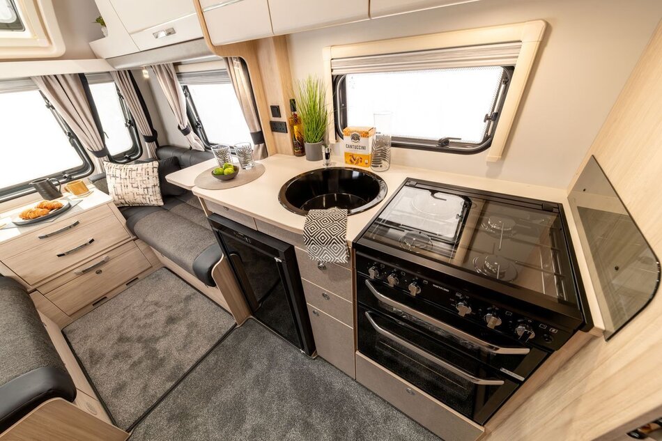 De keuken in de Apex 554 is een droom voor elke kookliefhebber. Geen behelpen op een klein pitje, maar een zeer luxe keuken voorzien van: