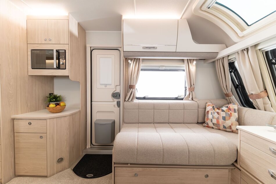 Het pronkstuk van deze caravan is de aparte slaapruimte met een royaal queensbed over dwars. U kunt aan beide zijden gemakkelijk in- en uitstappen, wat zorgt voor een optimaal slaapcomfort. Geen gedoe met klimmen over uw partner; hier geniet u van de rust die u verdient.