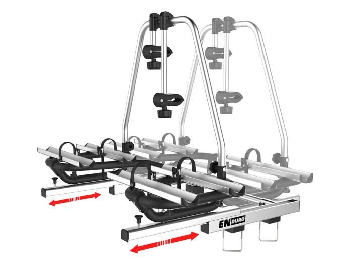 Uniek aan deze drager is het schuifsysteem. Dit makkelijk te bedienen uitschuifsysteem zorgt ervoor dat de bergruimte van de caravan altijd bereikbaar is. Het is een kwestie van het ontgrendelen van de veiligheidspinnen en de drager kan naar voren geschoven worden. De fietsen kunnen gewoon op de drager blijven staan! De fietsendrager is geschikt voor 2 (elektrische) fietsen. Het maximale draaggewicht van de drager is 60 kg.
