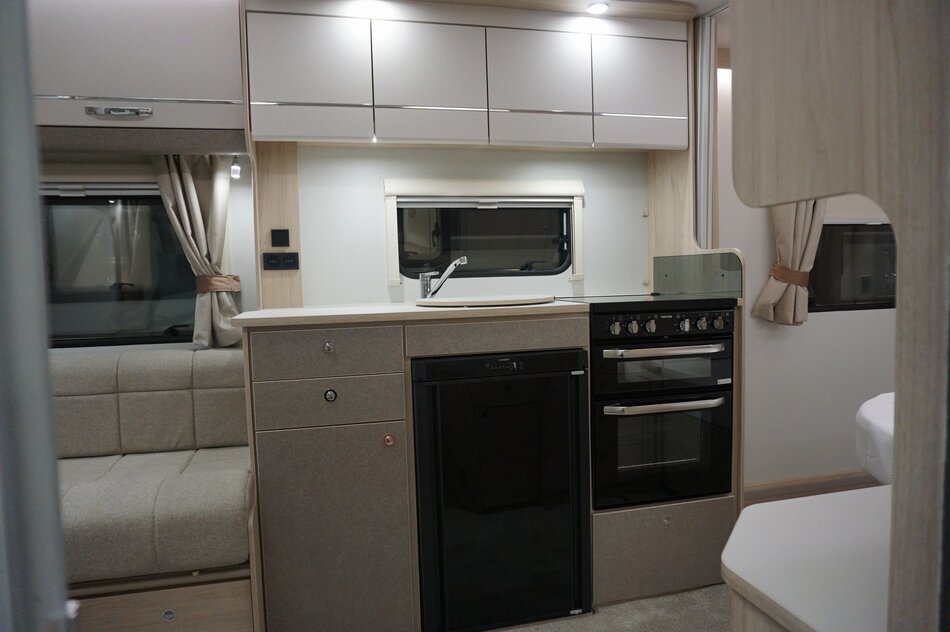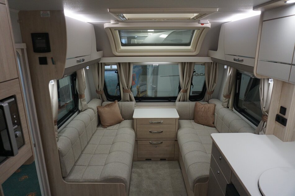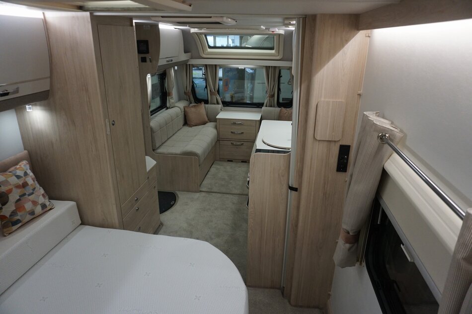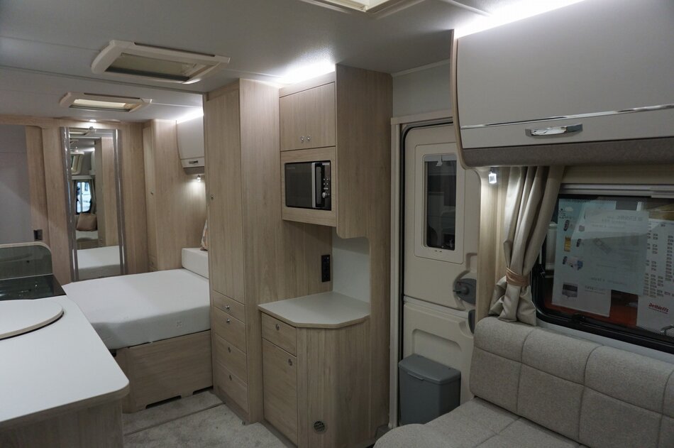 Elddis Avanté 554 2025, vrijstaand bed. Super complete uitvoering. Whale hetelucht verwarming en boiler. Luxe toiletruimte met douchecabine. Comfortabel vrijstaand bed op lattenbodem. Plisse horren. Berg ruimte onder bed bereikbaar door serviceluik. Alko ATC antslinger systeem. Prijs Incl: Opties. € 41.850.-.