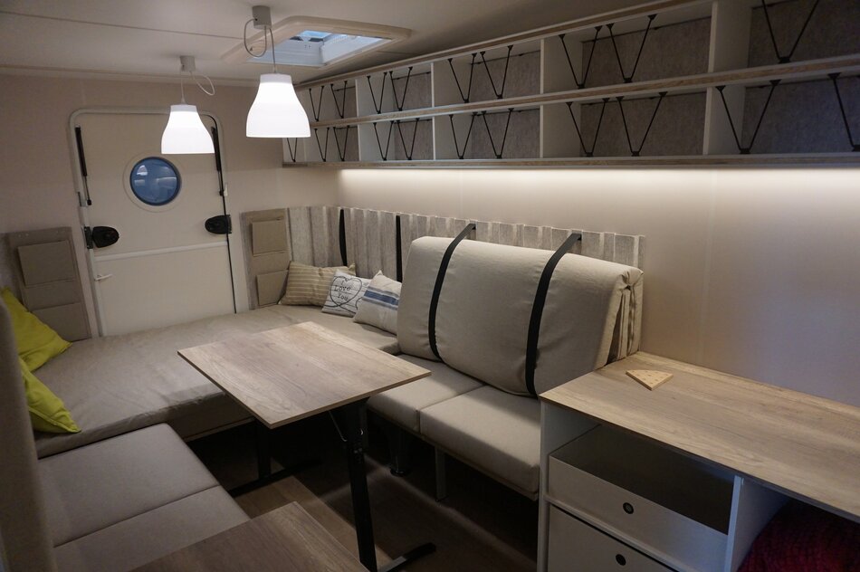 Veel kastruimte, Keukenhoek met grote lade en Compressor koelkist. Prachtige sfeerverlichting. Groot dakluik en openslaande achterdeur. Basisprijs € 19.200.-.