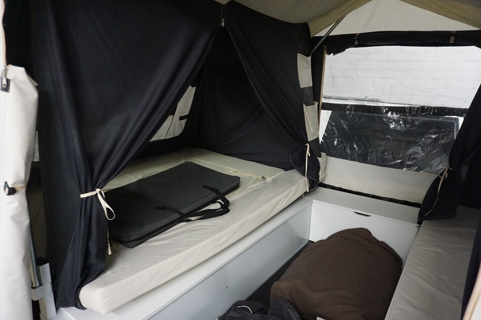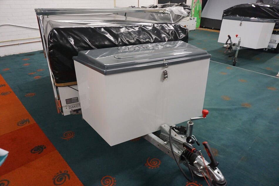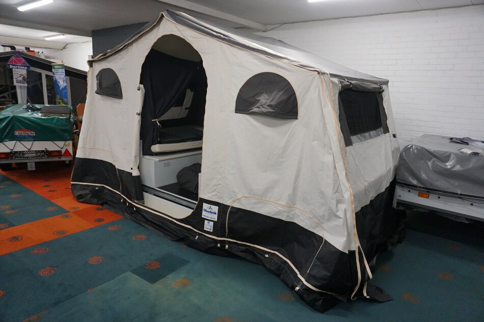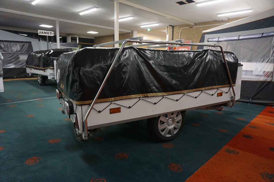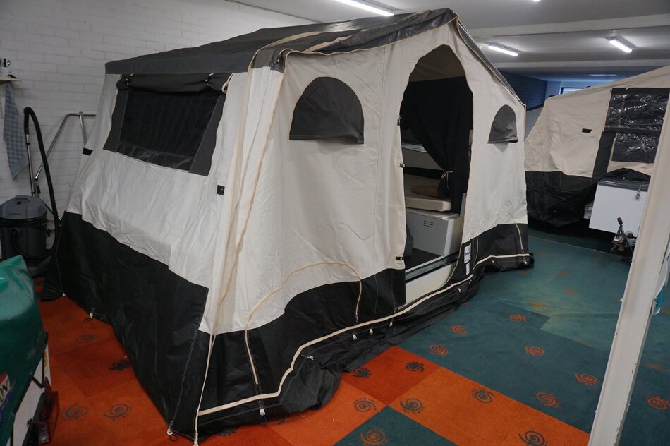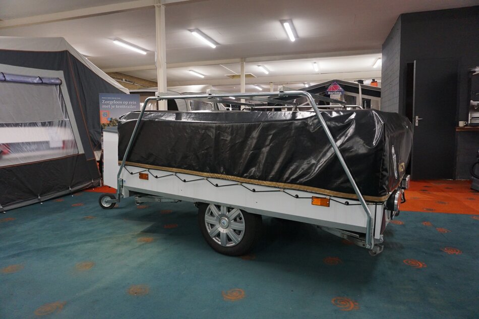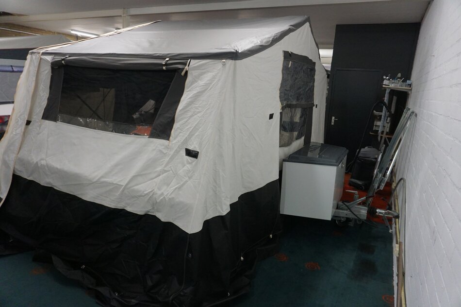 In zeer goede staat. Eenvoudig op te zetten boogtent met luifel en zijwanden. Ingeritst grondzeil. Grote disselbak. Imperial. Keuken kastje.