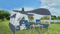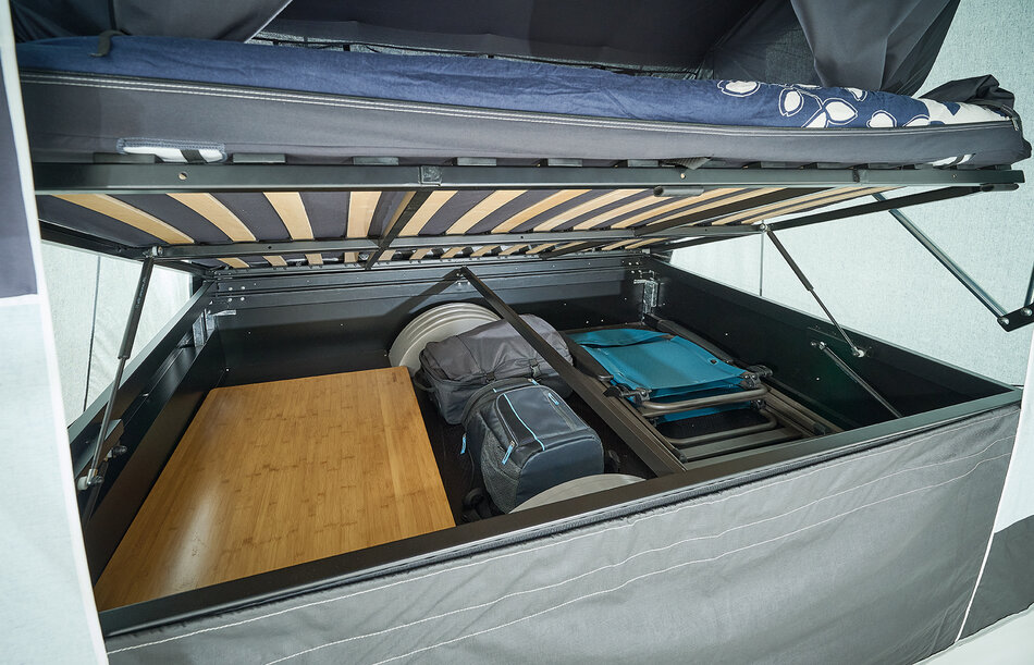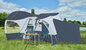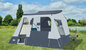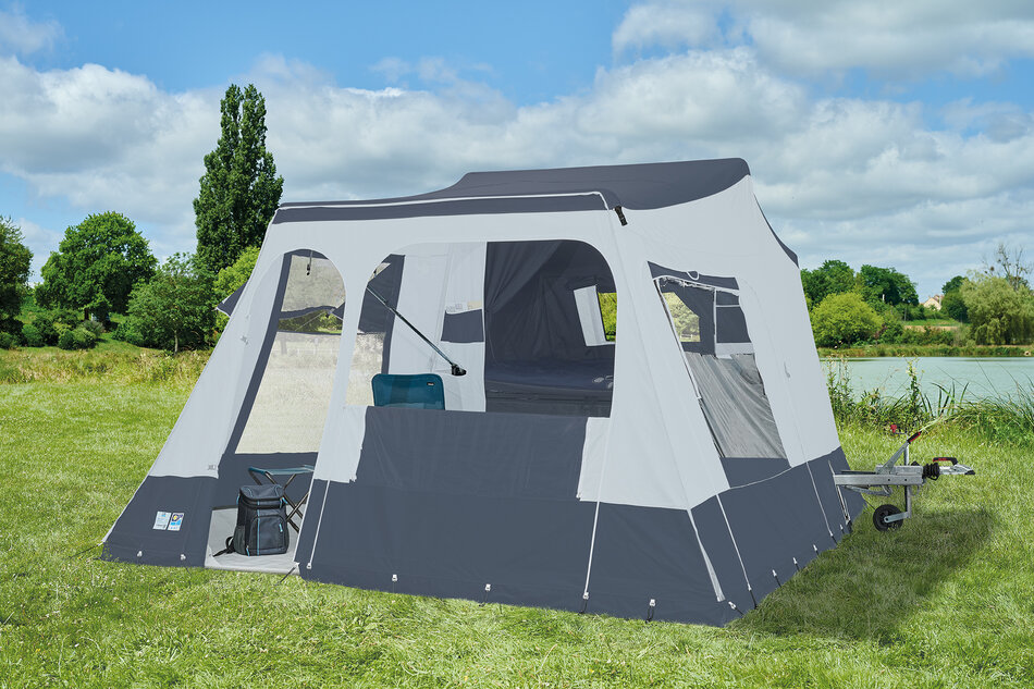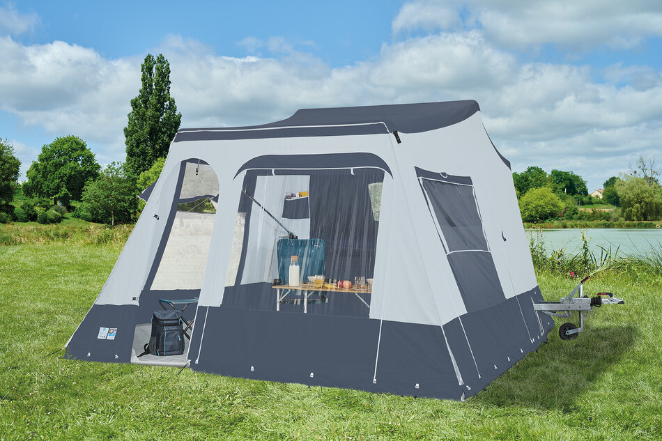De Compact Eco is nog sneller en gemakkelijker op te zetten (en zonder moeite door 1 persoon), want kleiner/compacter dan de Jametic ECO ! Alleen de (voor)tent wordt omhoog getrokken (met aangeritst grondzeil) en 2 schuine stangen uitschuiven en de tent is al klaar inclusief voortent !. De tent wordt rond de wagenbak perfect dicht afgespannen naar de grond toe.